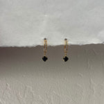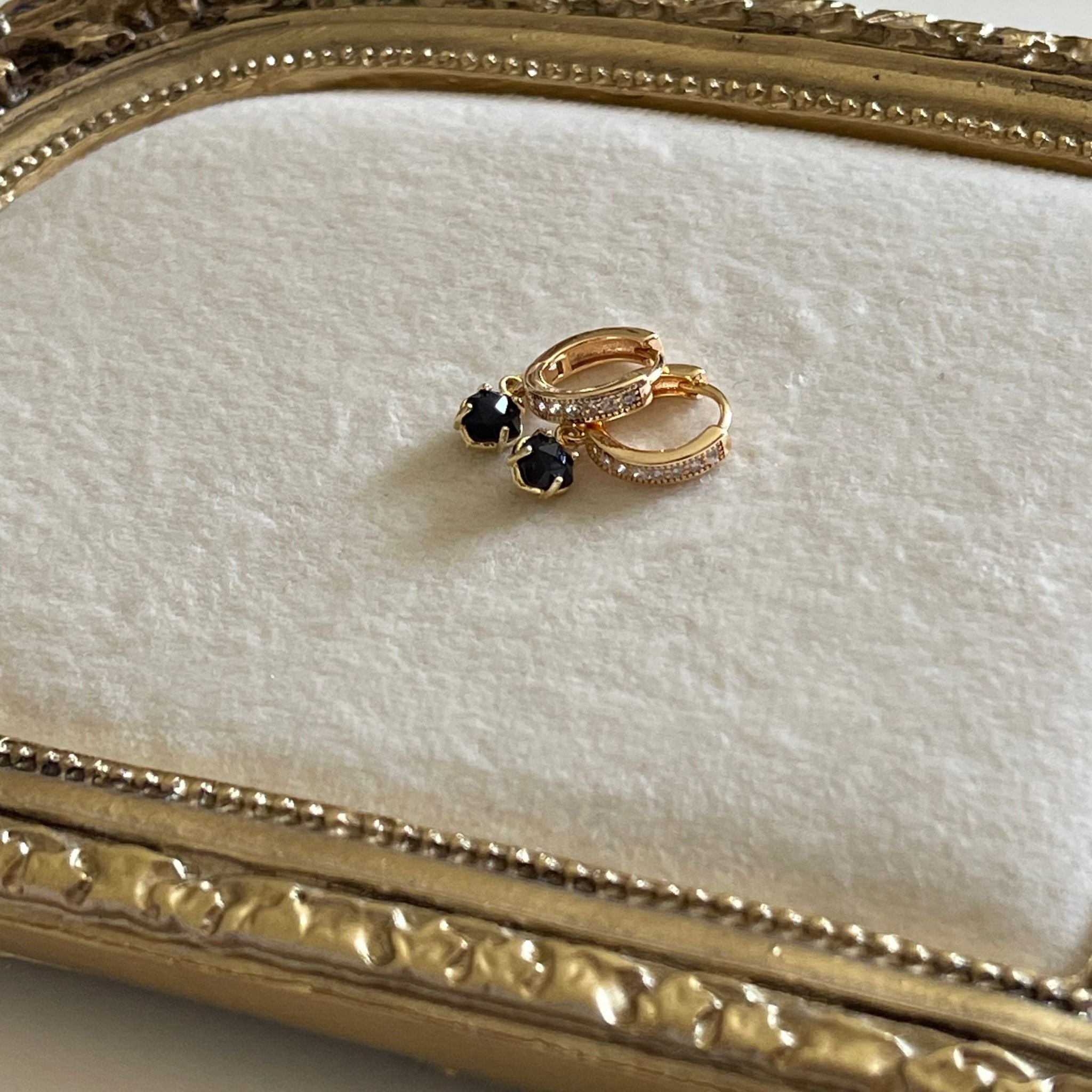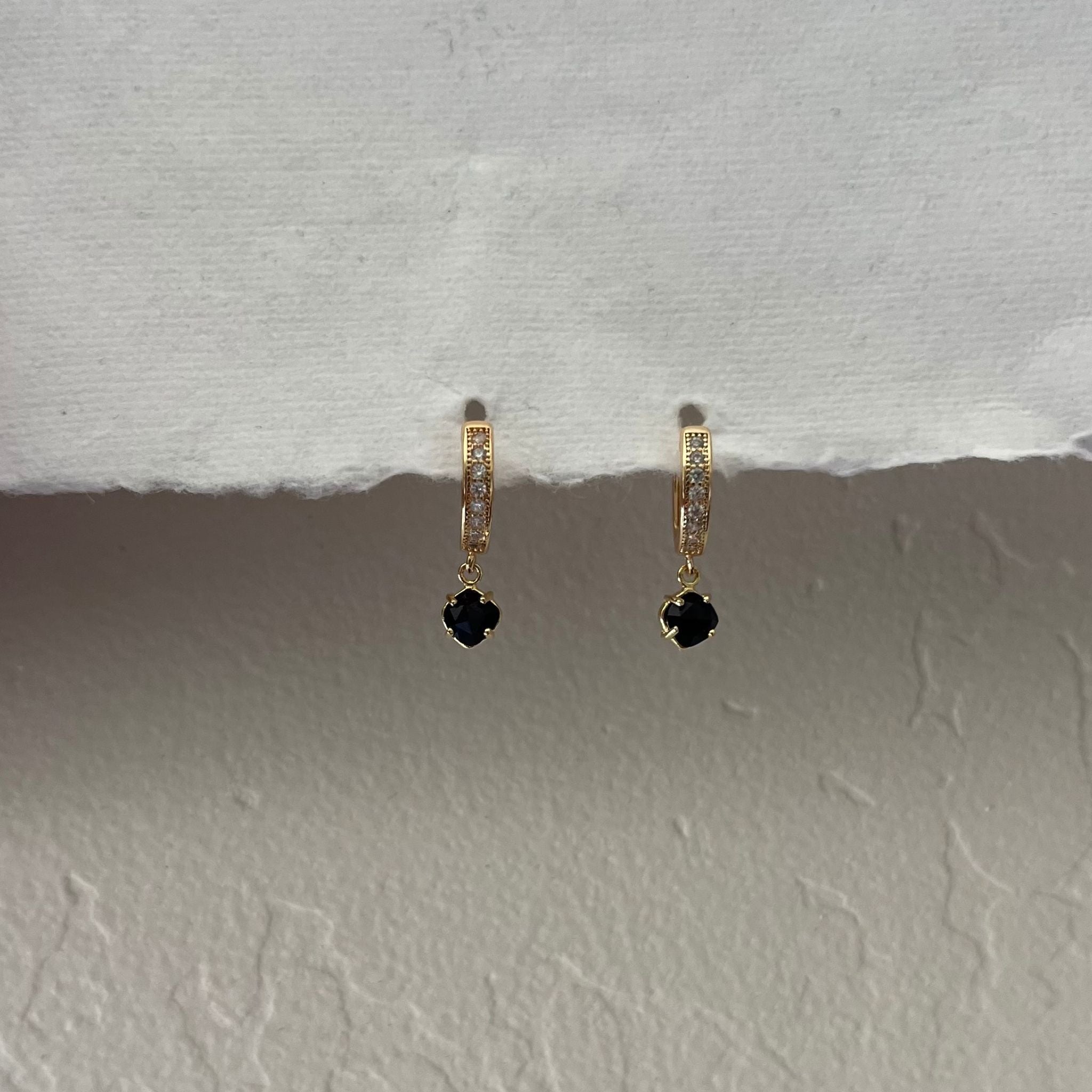 Design: Mini huggie hoops with diamond-like stones and dangling Black Onyx gemstone