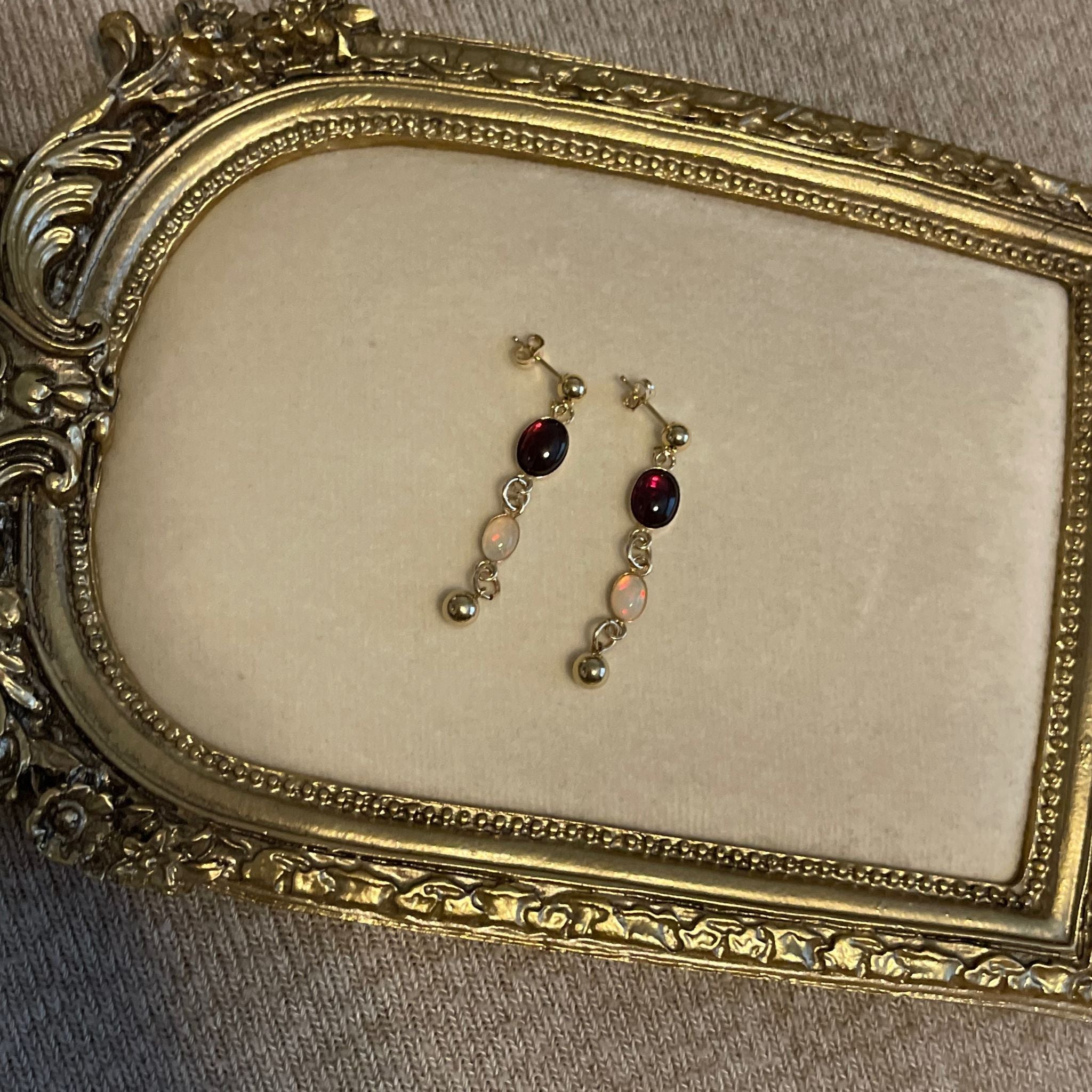 These Garnet & Opal gemstone dangle earrings bring together the deep, romantic richness of garnet with the soft, iridescent shimmer of opal. Each genuine gemstone is thoughtfully paired, creating a captivating contrast that dances beautifully in the light.