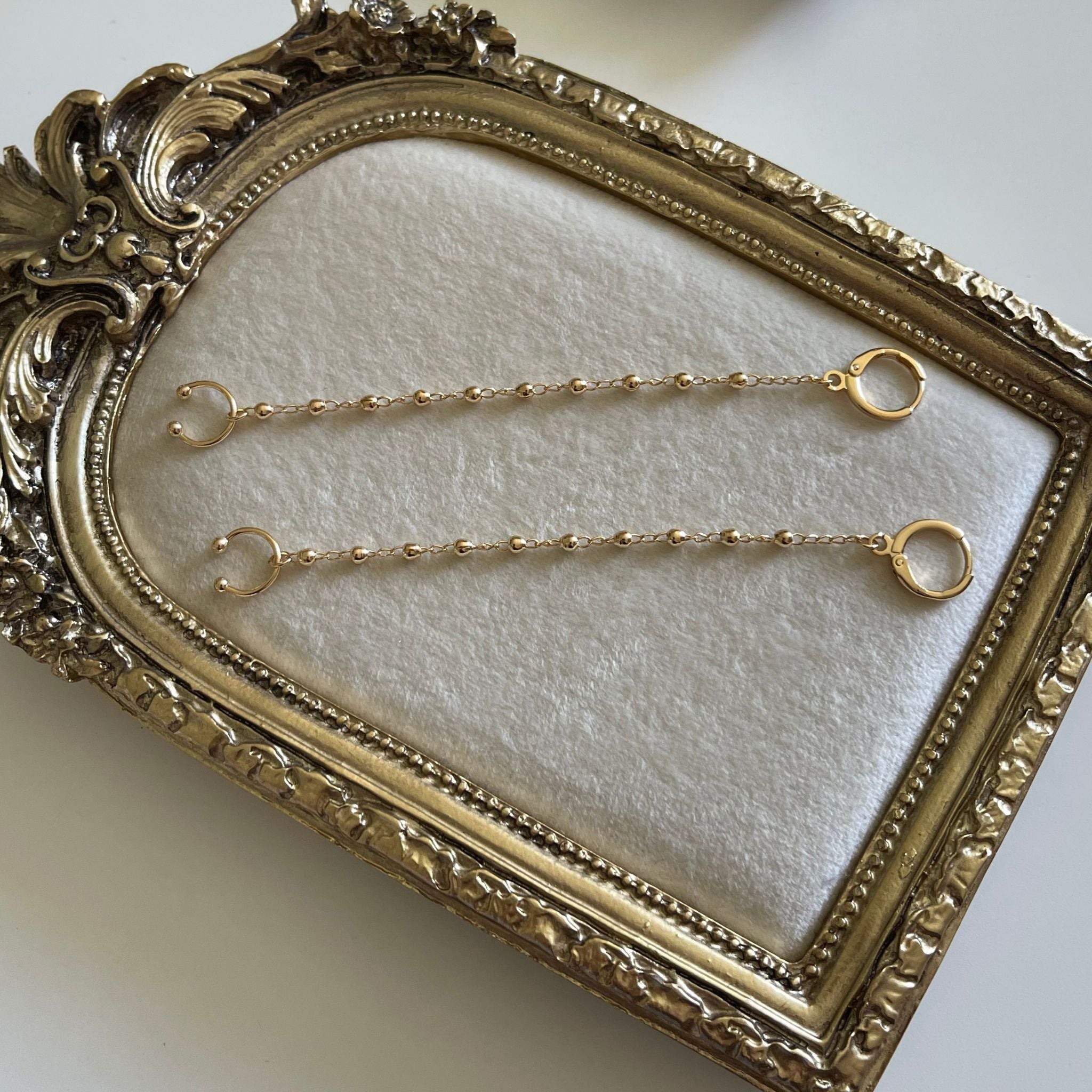 💡 Styling Tip: Wear the cuff on the upper ear and let the chain drop from the huggie hoop to create a graceful, layered look. Pair with a low bun or tousled waves so the pearls can sway and glow freely in the light.