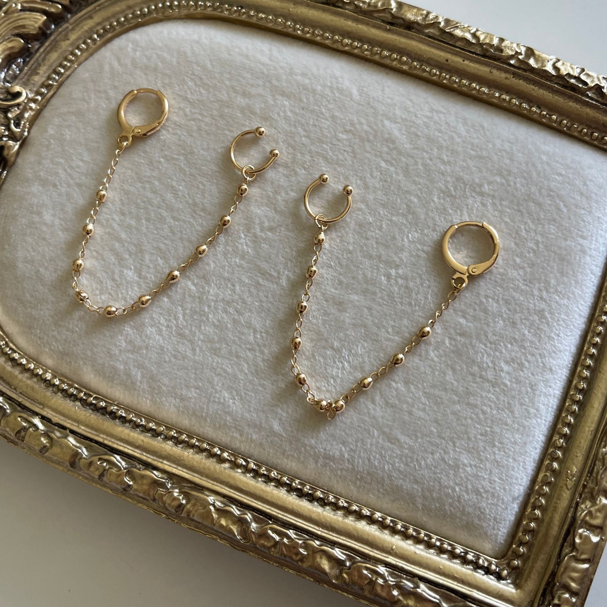 Design: Gold-plated dangle huggie hoop earrings with matching ear cuff & bead chain drop